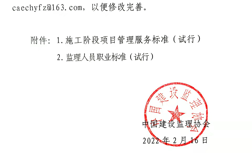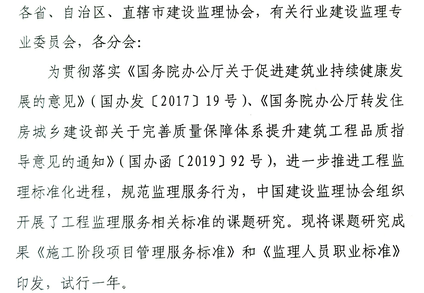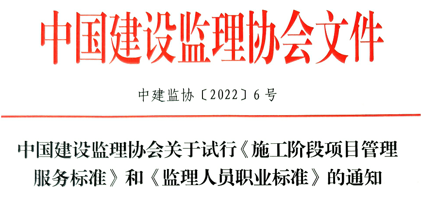 近日,中國建設監(jiān)理協(xié)會官網(wǎng)印發(fā)試行《施工階段項目管理服務標準》和《監(jiān)理人員職業(yè)標準》的通知。